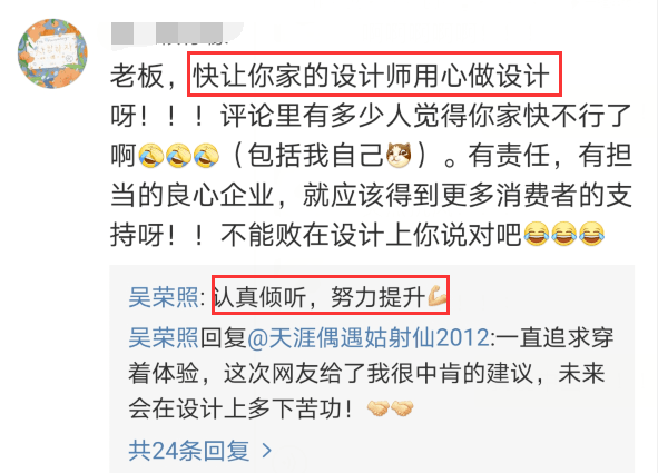 面对网友的支持,7月24日凌晨,吴荣照在微博表示:“近几年经过和团队的积极调整,已经取得了一定的效益。所面临的转型过程,依然非常艰难,但是倒也没有像许多网友所调侃的‘濒临破产’。我坚信只要守住初心、坚守实业,用心为用户打造优质的产品,总有一天会得到用户的认同。直到近日,河南水灾令我感同身受。自己尽的这份力量,意外得到网友们浪潮般的力挺和关爱,感觉受宠若惊,又有点‘蒙圈’,除了感恩还是感恩!”