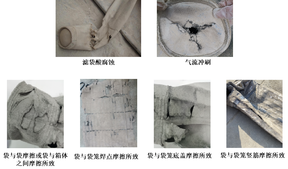 滤袋在运行过程中发生破损的原因有化学损伤(酸碱腐蚀、氧化和水解等)、气流冲刷(袋内和袋外)和机械摩擦等。