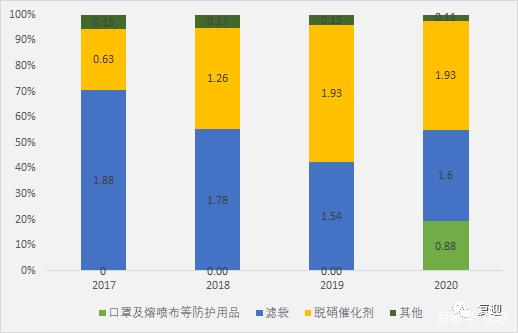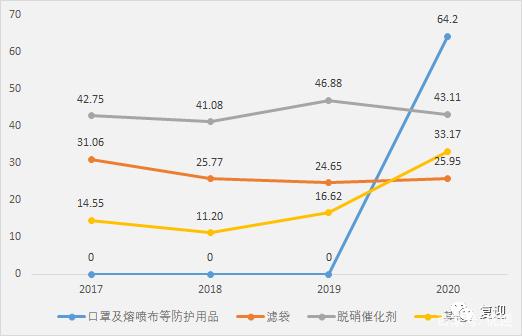 分产品来看,2020年口罩及熔喷布等防护用品实现营收0.88亿元,占比19.40%;滤袋实现营收1.60亿元,占比35.48%;脱硝催化剂实现营收1.93亿元,占比42.65%;其他实现营收0.11亿元,占比2.46%。